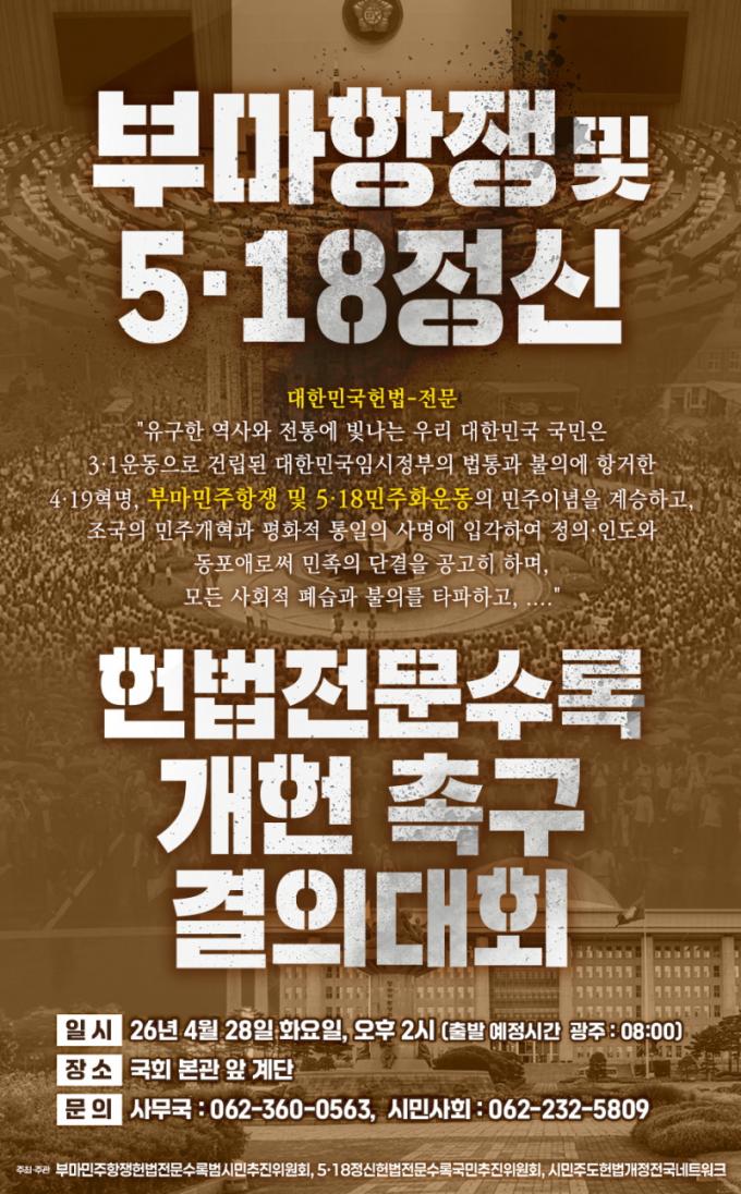 À̳¯ ±¹¹Î°áÀÇ´ëȸ´Â 5¡¤18Á¤½ÅÇå¹ýÀü¹®¼ö·Ï±¹¹ÎÃßÁøÀ§¿øÈ¸, ºÎ¸¶¹ÎÁÖÇ×ÀïÇå¹ýÀü¹®¼ö·Ï¹ü½Ã¹ÎÃßÁøÀ§¿øÈ¸, ½Ã¹ÎÁÖµµÇå¹ý°³Á¤Àü±¹³×Æ®¿öÅ© µî 3°³ ´Üü°¡ °øµ¿ ÁÖÃÖ¡¤ÁÖ°üÇÑ´Ù.