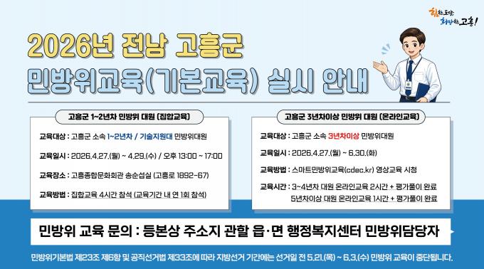 ¶ÇÇÑ, 3³âÂ÷ ÀÌ»ó ¹Î¹æÀ§´ë¿øÀº »çÀ̹ö±³À°À¸·Î ´ëüµÇ¸ç, 4¿ù 27ÀϺÎÅÍ 6¿ù 30ÀϱîÁö ¾È³»µÈ ¹Î¹æÀ§ »çÀ̹ö±³À°¼¾ÅÍ¿¡ Á¢¼ÓÇØ ±³À°À» À̼öÇØ¾ß ÇÑ´Ù. ´Ù¸¸, Àü±¹µ¿½ÃÁö¹æ¼±°Å ±â°£ÀÎ 5¿ù 21ÀϺÎÅÍ 6¿ù 3ÀϱîÁö´Â ±³À°ÀÌ ÀϽà ÁßÁöµÈ´Ù.