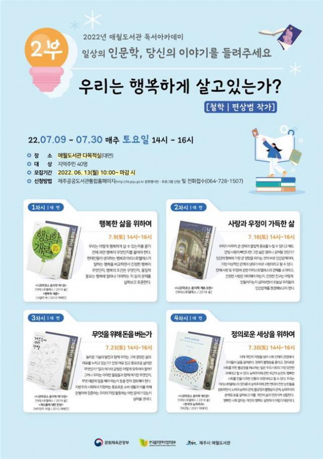 ÇÁ·Î±×·¥Àº 7¿ù 9ÀϺÎÅÍ 30ÀϱîÁö ¸ÅÁÖ Åä¿äÀÏ ¿ÀÈÄ 2½Ã¿¡ ¾Ö¿ùµµ¼°ü ´Ù¸ñÀû½Ç¿¡¼ ÁøÇàµÈ´Ù. °¿¬ ½ÅûÀº 6¿ù 13ÀϺÎÅÍ Á¦ÁÖµµ°ø°øµµ¼°ü ȨÆäÀÌÁö(http://lib.jeju.go.kr/)¸¦ ÅëÇØ 40¸í±îÁö ¼±Âø¼øÀ¸·Î Á¢¼öÇÒ ¼ö ÀÖ´Ù.