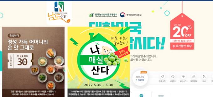 ÀÌ¿Í ÇÔ²² ³²µµÀåÅÍ ½Å±Ô°¡ÀÔ È¸¿ø ´ë»ó Àû¸³±Ý 1õ ¿ø Áö±Þ, Áö¿ª ¾î¸£½ÅÀÌ »ý»êÇÑ ±èÄ¡, ±èºÎ°¢, µÈÀå µî ³ëÀÎ ÀÏÀÚ¸® »ý»êǰ 30% Ưº°ÇÒÀÎÀü ¡®ÀººûÀåÅÍ¡¯, À¯±â³ó»ê¹°¡¤¸Å½Ç ±âȹÀü 20% ÇÒÀÎ µî ´Ùä·Î¿î Çà»ç¸¦ µ¿½Ã¿¡ ÆîÄ¡°í ÀÖ´Ù. ´Ù¸¸ Çà»ç´Â ¿¹»ê ¼ÒÁø ½Ã Á¶±â Á¾·áµÉ ¼ö ÀÖ´Ù.