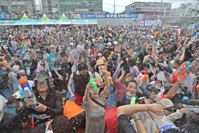 Áö»ó ÃÖ´ëÀÇ ¹°½Î¿òÀå¿¡ À̸¥ Âü°¡ÀÚµéÀº ½ñ¾ÆÁö´Â ¹°Áٱ⸦ ¸ÂÀ¸¸ç ¶Ç ÇÑ ¹ø ¶ß°Å¿î ¿¡³ÊÁö¸¦ ¹ß»êÇß´Ù. ´Þ¾Æ¿À¸¥ ÃàÁ¦ÀÇ ºÐÀ§±â´Â ¹ã±îÁö °è¼ÓµÆ´Ù. ÀåÈﱺ¹Î 100ÀÎÀÇ ¿¬ÁÖ·Î ½ÃÀÛÇÑ °³¸· Çà»ç´Â ¸¶Áß¹° ÇÕ¼ö½Ä, ºÒ²É³îÀÌ, ÃàÇϰø¿¬ µî ´Ùä·Î¿î ¸ð½ÀÀ¸·Î ÆîÃÄÁ³´Ù. ¹ã 9½Ã ½ÃÀÛÇÑ ¿öÅÍäÅÇ®ÆÄƼ´Â ÀþÀºÀ̵é°ú ¿Ü±¹ÀÎ »çÀÌ¿¡ ÃÖ°íÀÇ Àαâ ÇÁ·Î±×·¥À¸·Î ¼Õ²ÅÇû´Ù. À̳¯ Ç®ÆÄƼ´Â ¹Ú¸í¼ö, ÁÖÁÖ, ºí·±Æ® ¹êµå°¡ DJ·Î µîÀåÇØ °ü°´µéÀ» ¶ß°Å¿î ¹ÝÀÀÀ» À̲ø³Â´Ù.