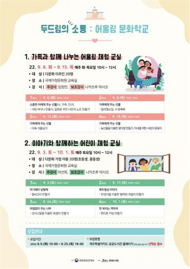 ÀÌ¿¡ Áö³ 8¿ù 1ÀϺÎÅÍ ¸ðÁý ÁßÀÎ ¡°¾Æµ¿ ÅëÇÕ ÇÁ·Î±×·¥¡±¿¡ ÀÌ¾î ¿À´Â 9ÀϺÎÅÍ´Â µµ¼°ü À̿롤¹æ¹®ÀÌ ¾î·Á¿î ´Ù¹®È °¡Á¤À» À§ÇÑ ¡°Ã£¾Æ°¡´Â µ¶¼¹®È ÇÁ·Î±×·¥¡± ¸ðÁýÀ» ½ÃÀÛÇÑ´Ù. °¢ ¼¼ºÎ ÇÁ·Î±×·¥µéÀ» ÁÖ°üÇÏ´Â Àü¹® ±â°üµéÀ» Áß½ÉÀ¸·Î ¼Ò°³ÇÏ¸é ±¹Á¦°¡Á¤¹®È¿ø°ú ÇÔ²²ÇÏ´Â <°¡Á·°ú ÇÔ²² ³ª´©´Â ¾î¿ï¸² üÇè ±³½Ç>, <À̾߱â¿Í ÇÔ²²ÇÏ´Â ¾î¸°ÀÌ Ã¼Çè ±³½Ç>Àº ´Ù¹®È ÀÌÁֹΠ¹× ¾Æµ¿À» ´ë»óÀ¸·Î ÁøÇàµÇ´Â âÀÛ Ã¼Çè ÇÁ·Î±×·¥À̸ç, ¼ºÎÁ¾ÇÕ»çȸº¹Áö°ü¿¡¼ ÁøÇàµÇ´Â <´Ù¹®È ÀÌÁÖ¿©¼ºÀÇ ´ÙÁ¤´Ù°¨ÇÑ ¸¸µé±â Ŭ·¡½º ¡°Èú¸µµµ°¨¡±>Àº ´Ù¹®È ÀÌÁÖ¹ÎÀ» ´ë»óÀ¸·Î ¸¶Å©¶ó¸Þ ¹× õ¿¬ ºñ´© »ýȰ °ø¿¹ ÇÁ·Î±×·¥ÀÌ´Ù.