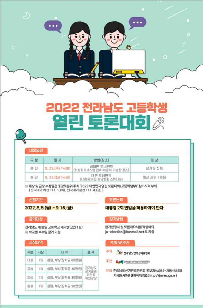 ´ëȸ Âü°¡¸¦ Èñ¸ÁÇÏ´Â ÇлýÀº 2ÀÎ 1ÆÀÀ» ±¸¼ºÇØ 9¿ù 16ÀϱîÁö Âü°¡ ½Åû¼ µî °ü·Ã ¼·ù¸¦ Àü³²¼±°üÀ§ ȨÆäÀÌÁö(http://jn.nec.go.kr)¿¡¼ ³»·Á ¹Þ¾Æ Àü³²¼±°üÀ§ È«º¸°ú À̸ÞÀÏ(jn-election@hanmail.net)·Î Á¦ÃâÇÏ¸é µÈ´Ù.