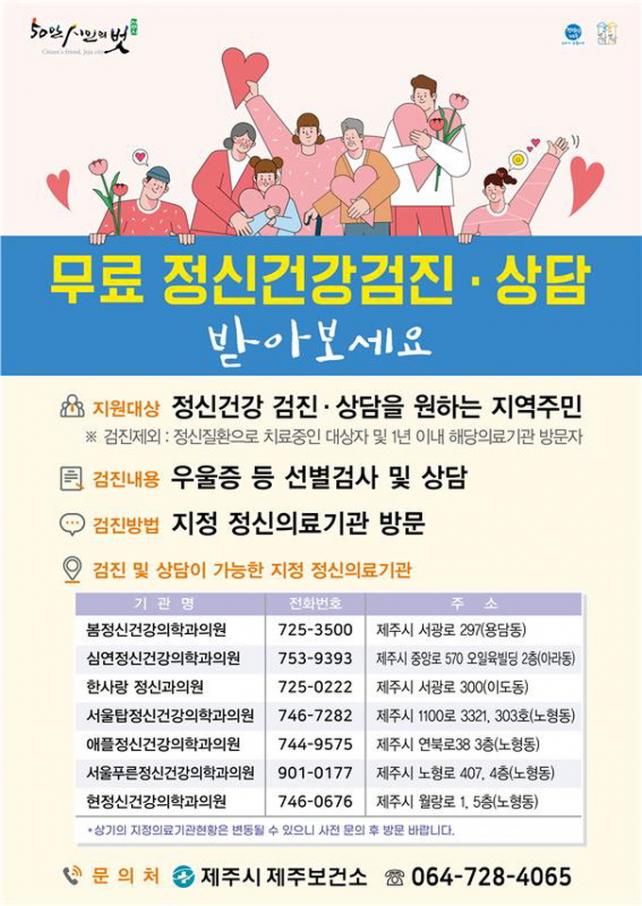 Áö¿ø ´ë»óÀº Á¤½Å °ËÁøÀÌ ÇÊ¿äÇÑ Á¦ÁÖµµ¹Î ´©±¸³ª Á¦Áֽà ³» ÁöÁ¤ Á¤½ÅÀÇ·á±â°üÀ» ¹æ¹®ÇÏ¿© 1~3ȸÂ÷±îÁö 5¸¸7,900¿ø Çѵµ ³»¿¡¼ °ËÁø(»ó´ã)ºñÁö¿ø ¹× °Ë»ç °á°ú¿¡ µû¶ó Àü¹®ÀÇÀÇ »ó´ã Ä¡·á¸¦ ¹ÞÀ» ¼ö ÀÖ´Ù. ÇÑÆí Á¦ÁÖº¸°Ç¼Ò´Â 2019³âºÎÅÍ Á¤½Å°Ç°°ËÁø ¹× »ó´ãºñ¸¦ Áö¿øÇØ ¿À°í ÀÖÀ¸¸ç 2022³â¿¡´Â 335¸í¿¡°Ô Á¤½Å°Ç°°ËÁø ¹× »ó´ãºñ¸¦ Áö¿øÇÏ¿´´Ù.