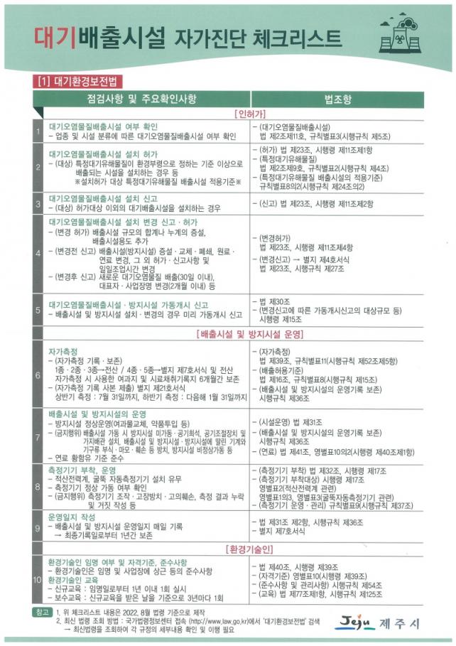 ÁÖ¿ä ȯ°æ¹ý·ÉÀº ÀÎ‧Çã°¡ »çÇ×, ¹èÃâ ¹× ¹æÁö½Ã¼³ ¿î¿µ, ȯ°æ±â¼úÀÎ, ¿Ã¹Ù·Î½Ã½ºÅÛ ÀÔ·Â, Æó±â¹° 󸮱âÁØ µîÀÇ ³»¿ëÀ¸·Î ±¸¼ºÇÏ¿´°í, Á¡°ËÇ׸ñÀº ºÐ¾ßº° ¹èÃâ‧¹æÁö½Ã¼³ Á¤»ó °¡µ¿ ¹× ¹èÃâÇã¿ë±âÁØ Áؼö ¿©ºÎ µî¿¡ ´ëÇØ ÀÚ°¡Áø´ÜÀÌ °¡´ÉÇϵµ·Ï Çϰí,Áöµµ‧Á¡°Ë ½Ã, ÁÖ·Î Á¡°ËÇÏ´Â Ç׸ñÀ» Áß½ÉÀ¸·Î Á¤¸®ÇÏ¿© »ç¾÷À庰 ¸ÂÃãÇüÀ¸·Î Ȱ¿ëÇÒ ¼ö ÀÖ°Ô ÇÏ¿´À¸¸ç, ¶ÇÇÑ, ÀÚ°¡Áø´Ü Á¡°ËÇ¥´Â Á¦ÁÖ½Ãû ȨÆäÀÌÁö¿¡ °Ô½ÃÇÏ¿© ¾ðÁ¦³ª À̿밡´É Çϵµ·Ï ÇÏ¿´´Ù.