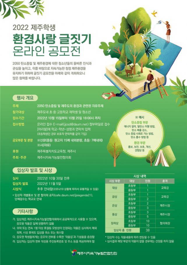 °ø¸ð ÁÖÁ¦´Â 2050 ź¼ÒÁ߸³ ¹× Á¦ÁÖȯ°æ¿¡ ´ëÇÑ ÀÚÀ¯ ÁÖÁ¦À̸ç, »ê¹® ¶Ç´Â ½Ã¸¦ ÀÛ¼ºÇÏ¿© 10¿ù 15ÀϺÎÅÍ 10¿ù 25ÀÏ 18½Ã±îÁö Á¦Áֽà Áö¼Ó°¡´É¹ßÀüÇùÀÇȸ À̸ÞÀÏ(jjcsd@daum.net)·Î Á¦ÃâÇÏ¸é µÈ´Ù.