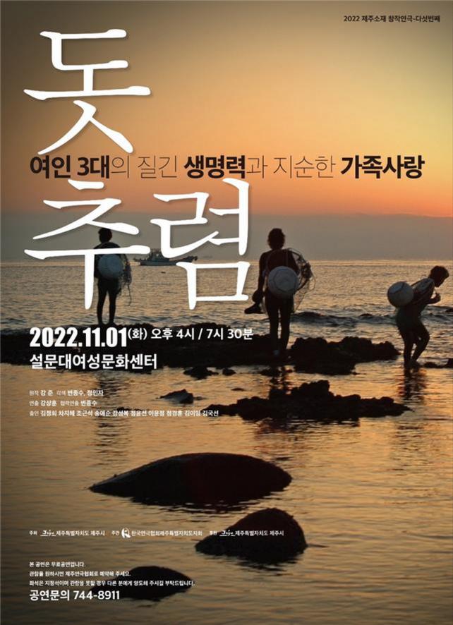 µµ³» ±Ø´Ü °£ Çù¾÷À» ÅëÇØ Á¦ÀÛÇÏ´Â Á¦ÁÖ ¼ÒÀç âÀÛ¿¬±ØÀº ±×µ¿¾È Á¦ÁÖ ÀÇ³à ¡®È«À±¾Ö¡¯¿Í Á¦ÁÖ ¿©¼º Ç×ÀϿ°¡ ¡®°Æò±¹¡¯À» ¼ÒÀç·Î °ø¿¬À» ¼±º¸¿´´Ù. ¿ÃÇØ Á¦5ȸ âÀÛ¿¬±Ø°ø¿¬ÀÎ ¡°µ¾Ãß·Å¡±Àº 4¡¤3»ç°ÇÀ¸·Î °¡Á·À» ÀÒÀº À¯¿Á¼ø ÇÒ¸Ó´Ï¿Í ±× ¼ÕÁÖ¸ç´À¸®±îÁö ¿©ÀÎ 3´ëÀÇ »ý¸í·Â°ú °¡Á·ÀÇ Áö¼øÇÑ »ç¶ûÀ» ±×¸° ÀÛǰÀÌ´Ù.