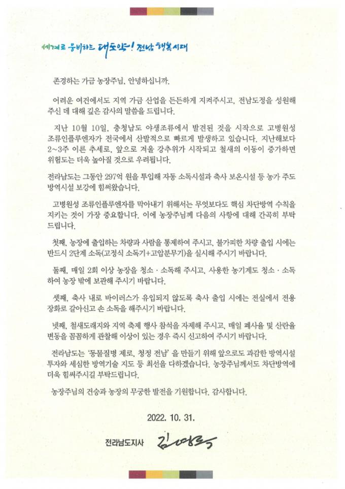 ±è¿µ·Ï Àü³²µµÁö»ç´Â ¼Çѹ®À» ÅëÇØ ¡°Áö³ 10¿ù Ãæ³²¿¡¼ °íº´¿ø¼º Á¶·ùÀÎÇ÷翣ÀÚ°¡ °ËÃâµÈ °ÍÀ» ½ÃÀÛÀ¸·Î Àü±¹ ¾ß»ýÁ¶·ù¿Í °¡±Ý³óÀåÀ¸·Î ºü¸£°Ô È®»êÇϰí ÀÖ´Ù¡±¸ç ¡°µµ³» À¯ÀÔÀ» ¸·±â À§ÇØ °¡±Ý³óÀå¿¡¼ ÇÙ½É ¹æ¿ª¼öÄ¢À» öÀúÈ÷ ÁöÄÑÁÙ °Í¡±À» °Á¶Çß´Ù.