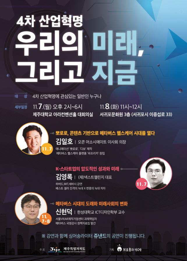 7ÀÏ Á¦ÁÖ´ëÇб³ ¾Æ¶óÄÁº¥¼ÇȦ(´ëȸÀǽÇ)¿¡¼ û³âÀ» ´ë»óÀ¸·Î ¡®¸ÞŸ¹ö½º¡¯¿Í ¡®4Â÷ »ê¾÷Çõ¸í ½ºÅ¸Æ®¾÷¡¯À» ÁÖÁ¦·Î Ư°ÀÌ ¿¸°´Ù. ¿ÀÈÄ 2½Ã¿¡´Â ±èÀÏÈ£ ¿ÀÄÜ ¾î¼Ò½Ã¿¡ÀÌÆ® ÀÌ»çȸ ÀÇÀåÀÌ ¡®»Ç·Î·Î, ÄÜÅÙÃ÷ ±â¹ÝÀ¸·Î ¸ÞŸ¹ö½º ÇコÄÉ¾î ½Ã´ë¸¦ ¿´Ù¡¯¶ó´Â ÁÖÁ¦·Î Ư°À» ÇÑ´Ù.