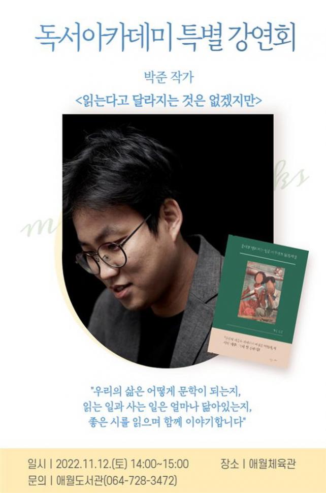ÀÛ°¡ °¿¬È¸´Â 11¿ù 12ÀÏ Åä¿äÀÏ ¿ÀÈÄ 2½Ã <2022 ¾Ö¿ù ºÏ Æä½ºÆ¼¹ú> Çà»çÀå ¹«´ë(Àå¼Ò : ¾Ö¿ùüÀ°°ü)¿¡¼ ÁøÇàµÈ´Ù. °¿¬ Âü¿©´Â 11¿ù 7ÀϺÎÅÍ Á¦ÁÖµµ°ø°øµµ¼°ü ȨÆäÀÌÁö(http://lib.jeju.go.kr/)¸¦ ÅëÇØ »çÀü ¿¹¾à 40¸í ½Åû °¡´ÉÇϰí, ÇöÀå Á¢¼ö´Â 30¸í±îÁö °¡´ÉÇÏ´Ù.