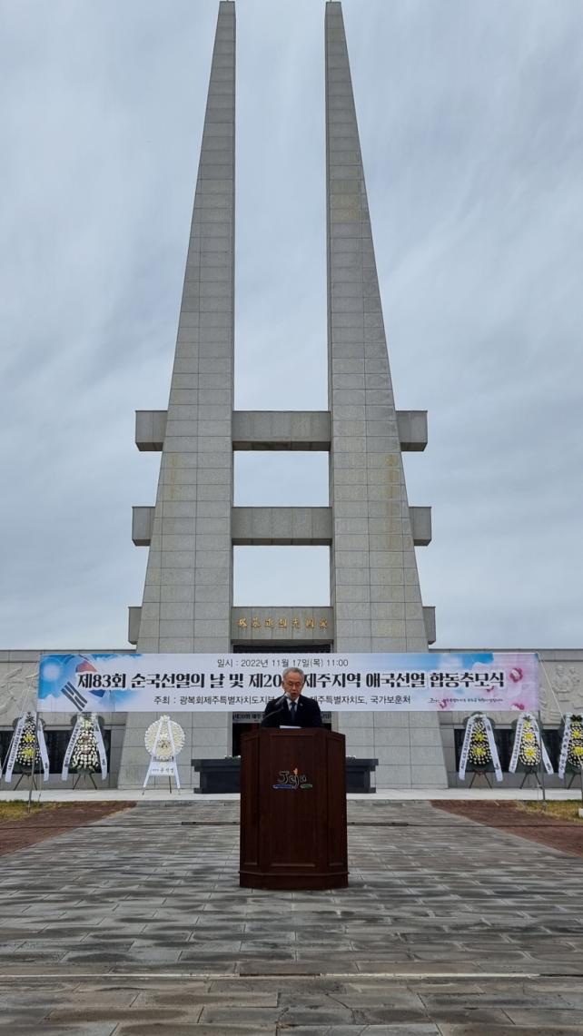 À̳¯ Çà»ç¿¡´Â Á¶±¹ µ¶¸³°ú ¹ÎÁ· ÀÚÁ¸À» À§ÇØ Çå½ÅÇÑ ¼±¿µéÀÇ Èñ»ý°ú °øÇåÀ» ±â¸®°í ÀÚÁÖµ¶¸³Á¤½ÅÀ» °è½ÂÇϱâ À§ÇØ µµ³» ÁÖ¿ä ±â°ü¡¤´ÜüÀå ¹× ±¤º¹È¸ Á¦ÁÖµµÁöºÎÀå°ú ±¤º¹È¸¿ø, º¸ÈÆ ´ÜüÀå°ú ȸ¿ø µî 300¿©¸íÀÌ Âü¼®Çß´Ù.
