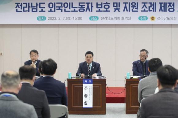 ÁÂÀåÀ» ¸ÃÀº ÁÖÁ¾¼· ÀÇ¿øÀº ¡°¡®Àü¶ó³²µµ ¿Ü±¹ÀÎ ³ëµ¿ÀÚ º¸È£ ¹× Áö¿ø Á¶·Ê¡¯ Á¦Á¤À» À§ÇÑ Åä·Ðȸ¿¡¼ ³ª¿Â ¼ÒÁßÇÑ Àǰ߰ú ¿äû»çÇ׵鿡 ´ëÇØ Àü¶ó³²µµ¿Í Àü¶ó³²µµÀÇȸ°¡ Çù·ÂÇØ¼ ÃÖ´ëÇÑ Á¤Ã¥¿¡ ¹Ý¿µÇÏ°í °ü·Ã Á¶·Ê°¡ Á¶¼ÓÈ÷ Á¦Á¤µÉ ¼ö ÀÖµµ·Ï ³ë·ÂÇϰڴ١±°í Åä·Ðȸ¸¦ ¸¶¹«¸® Áö¾ú´Ù.