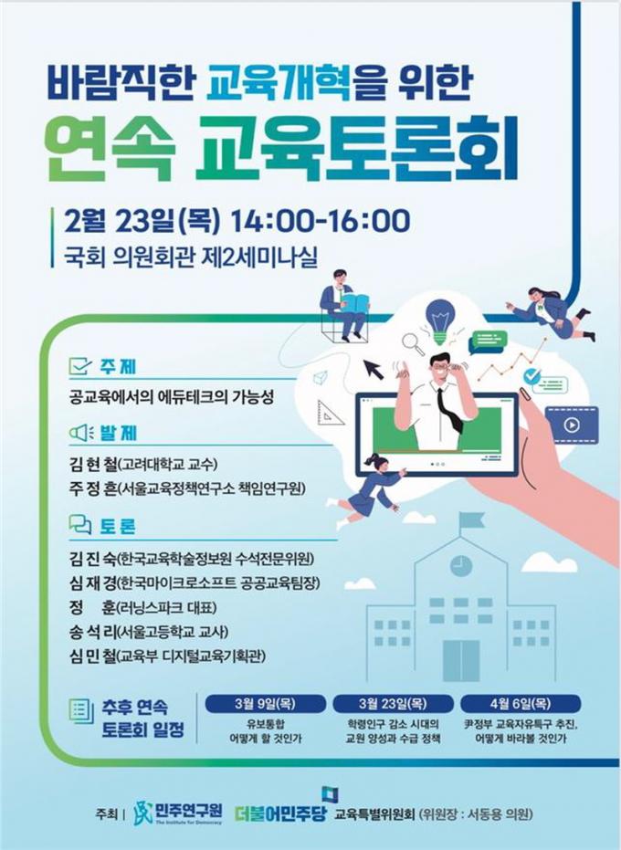 ¡®¿¡µàÅ×Å©´Â ±³À°À» Çõ½Å ½Ãų °ÍÀΰ¡¡¯, ¡®Çб³·Î °£ AI¿¡µàÅ×Å©¡¯¸¦ ÁÖÁ¦·Î °í·Á´ëÇб³ ±èÇöö ±³¼ö¿Í ¼¿ï±³À°¿¬±¸Á¤º¸¿ø ÁÖÁ¤Èç ¼±ÀÓ¿¬±¸À§¿øÀÌ °¢°¢ ¹ßÁ¦¿¡ ³ª¼¸ç, ±èÁø¼÷ ¼ö¼®¿¬±¸À§¿ø(Çѱ¹±³À°ÇмúÁ¤º¸¿ø)°ú ½ÉÀç°æ °ø°ø±³À°ÆÀÀå(Çѱ¹¸¶ÀÌÅ©·Î¼ÒÇÁÆ®), Á¤ÈÆ ´ëÇ¥(·¯´×½ºÆÄÅ©), ¼Û¼®¸® ¼±»ý´Ô(¼¿ï°íµîÇб³ Á¤º¸±³»ç), ½É¹Îö ±¹Àå(±³À°ºÎ µðÁöÅб³À°±âȹ°ü)ÀÌ Åä·ÐÀÚ·Î ÇÔ²²ÇÒ ¿¹Á¤ÀÌ´Ù. ÁÂÀåÀº ±³À°Æ¯º°À§¿øÈ¸ ¼µ¿¿ë À§¿øÀåÀÌ ¸Ã´Â °¡¿îµ¥, ±¹È¸ ±³À°À§¿øÈ¸ °¹ÎÁ¤, µµÁ¾È¯ ÀÇ¿øµµ Âü¼®ÇÏ¿© ¿¡µàÅ×Å© Á¤Ã¥ ¼ö¸³¿¡ ´ëÇÑ ÀǰßÀ» °³ÁøÇÒ ¿¹Á¤ÀÎ °ÍÀ¸·Î ¾Ë·ÁÁ³´Ù.