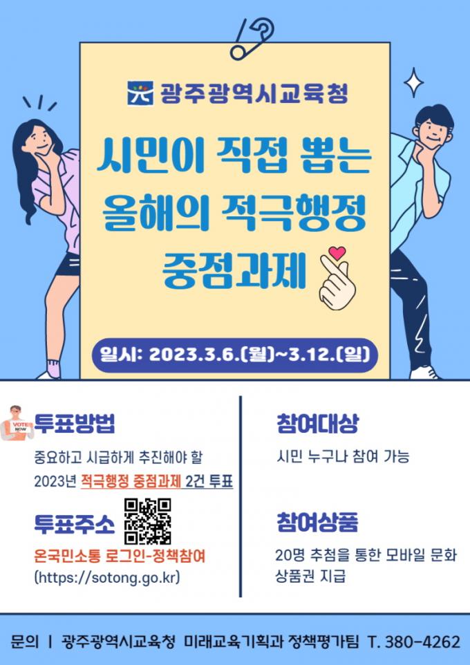 5ÀÏ ±¤Áֽñ³À°Ã»¿¡ µû¸£¸é 2023³â Àû±ØÇàÁ¤ ÁßÁ¡°úÁ¦·Î ¹ß±¼ÇÑ 6°ÇÀÇ »ç¾÷¿¡ ´ëÇØ ¿Â¶óÀÎ ½Ã¹ÎÅõÇ¥¸¦ ½Ç½ÃÇÑ´Ù. À̸¦ ÅëÇØ ÁßÁ¡°úÁ¦ 2°ÇÀ» ÃÖÁ¾ ¼±Á¤ÇÏ°í ¿ì¼± ÃßÁøÇÔÀ¸·Î½á ½Ã¹ÎÀÌ Ã¼°¨ÇÒ ¼ö ÀÖ´Â ¼º°ú¸¦ âÃâÇÑ´Ù´Â ¹æÄ§ÀÌ´Ù. ƯÈ÷, ¿ÃÇØ´Â ½Ã¹ÎµéÀÇ ¸ñ¼Ò¸®¸¦ ¹Ý¿µÇϱâ À§ÇØ ½Ã¹ÎÀÌ Á÷Á¢ ½Ã±³À°Ã»ÀÇ Àû±ØÇàÁ¤ ÁßÁ¡°úÁ¦¸¦ ÃÖÁ¾ ¼±Á¤Çϵµ·Ï Çß´Ù. ¿Â¶óÀÎ ÅõÇ¥´Â ÇàÁ¤¾ÈÀüºÎ ¡®¿Â±¹¹Î¼ÒÅ롯 ´©¸®Áý ³» Á¤Ã¥Âü¿©-±¹¹Î½É»ç¿¡¼ °¡´ÉÇÏ´Ù. À¥Æ÷½ºÅÍ ³» QRÄڵ带 ÅëÇØ¼µµ °£´ÜÇÏ°Ô Á¢¼ÓÇÒ ¼ö ÀÖ´Ù.