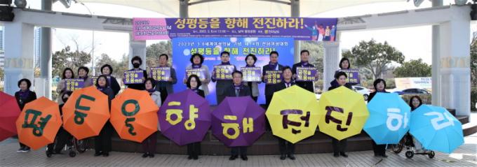 Àü³²¿©¼ºÀαǴÜü¿¬ÇÕ(ȸÀå Ȳ½Â¿Á) ÁÖÃÖ·Î ¿¸° À̳¯ Çà»ç¿¡´Â °ü°´ Áï¼® ¹ß¾ð, Àü³²¿©¼º¼±¾ð¹® ³¶µ¶, °Å¸®ÇàÁø µîÀ¸·Î ÁøÇàµÆ´Ù. °ü°´ Áï¼® ¹ß¾ð¿¡¼± ¡®¼¼»óÀ» ÇâÇØ ¸»ÇÏ´Ù¡¯¸¦ ÅëÇØ ±èº¸¹Ì °Áø±ºÀÇȸ ÀÇÀå°ú ¹Ú¼±¿Á ¿©¼º³ó¾÷ÀÎ µî 4°³ ºÐ¾ß¿¡¼ ÀÏÇÏ´Â ¿©¼º ´ëÇ¥°¡ ¹ß¾ð¿¡ ³ª¼¹´Ù. Çѱ¹¿¡¼, Àü³²¿¡¼, ÀÏÅÍ¿¡¼ ¿©¼ºÀ¸·Î »ì¸é¼ °Þ¾ú´ø ºÒÆòµî°ú Â÷º°À» ¾ê±âÇÏ¸ç »çȸ ¹®Á¦Á¡°ú °³¼± ¹æ¾ÈÀ» ¸ð»öÇß´Ù.