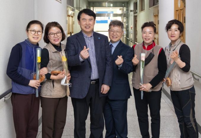 À̳¯ ¿ÀÀü ÀÌÁ¤¼± ±³À°°¨°ú Àå¿ì»ï ºÎ±³À°°¨ µî °£ºÎµéÀº °¢ °ú »ç¹«½ÇÀ» ¹æ¹®ÇØ Á÷¿øµéÀ» °Ý·ÁÇÏ¸ç ¹Ì¸® ÁغñÇÑ »§°ú Àå¹Ì²ÉÀ» Àü´ÞÇß´Ù.