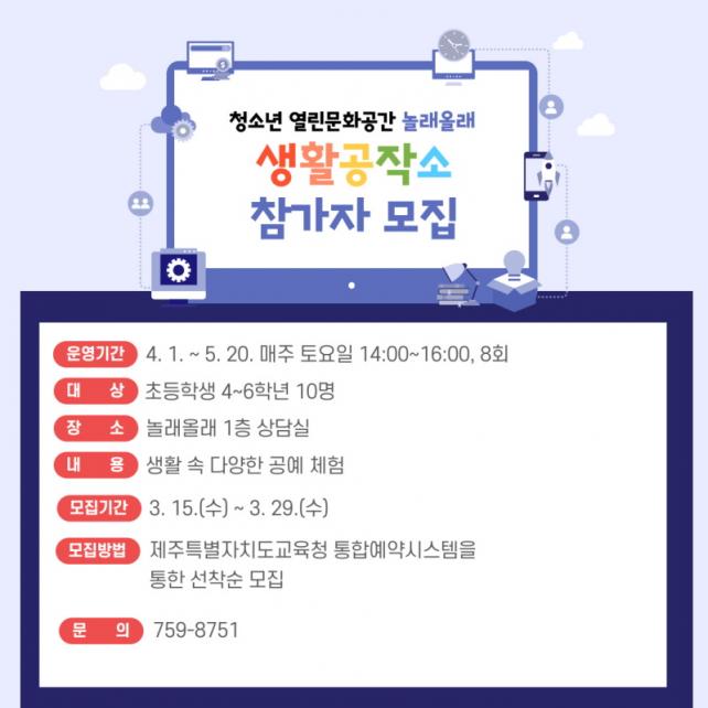 À̹ø ÇÁ·Î±×·¥Àº ¸ñ°ø¿¹·Î Æ®·¹ÀÌ ¸»µé±â, ³ÀŲ¾ÆÆ®·Î ½Ã°è ¸¸µé±â, Ä«³×ÀÌ¼Ç ²Éºñ´© ¸¸µé±â µî ´Ù¾çÇÑ °ø¿¹ Á¦ÀÛ È°µ¿À» üÇèÇØº»´Ù. ´ë»óÀº ÃʵîÇлý 4~6Çгâ 10¸íÀ¸·Î 4¿ù 1ÀÏ(Åä)ºÎÅÍ 5¿ù 20ÀÏ(Åä)±îÁö(8ȸ) ¸ÅÁÖ Åä¿äÀÏ ¿ÀÈÄ 2½Ã¿¡ û¼Ò³â ¿¸°¹®È°ø°£(³î·¡¿Ã·¡) 1Ãþ ȸÀǽǿ¡¼ ¿î¿µÇϸç, ¸ðÁýÀº ¿À´Â 3¿ù 15ÀÏ(¼ö) 10½ÃºÎÅÍ Á¦ÁÖÆ¯º°ÀÚÄ¡µµ±³À°Ã» °ø°øµµ¼°ü ȨÆäÀÌÁö(https://org.jje.go.kr/lib)¿¡¼ ½ÅûÇÒ ¼ö ÀÖ´Ù. ±âŸ ÀÚ¼¼ÇÑ »çÇ×Àº û¼Ò³â ¿¸°¹®È°ø°£[³î·¡¿Ã·¡](¢Ï759-8751)À¸·Î ÀüÈ ¹®ÀÇ ¶Ç´Â µµ¼°ü ȨÆäÀÌÁö °øÁö»çÇ×À» ÂüÁ¶ÇÏ¸é µÈ´Ù.
