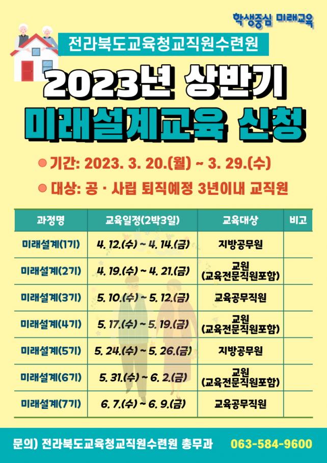 À̹ø ±³À°Àº Á¤³â ÀÌÈÄ ´Ã¾î³ »î°ú ȯ°æº¯È¿¡ ´Éµ¿ÀûÀÎ ´ëó°¡ °¡´ÉÇϵµ·Ï ½ÇÁúÀûÀ¸·Î µµ¿òÀÌ µÉ ¼ö ÀÖ´Â À繫¡¤ÀçÃë¾÷¡¤¸¶À½Ä¡À¯ µîÀÇ ´Ù¾çÇÑ °úÁ¤À» Æí¼ºÇß´Ù. ƯÈ÷, ¿ÃÇØ´Â ÅðÁ÷ ÀÜ¿© ÀçÁ÷±â°£ 3³â À̳»ÀÎ Àü¶óºÏµµ±³À°°¨ ¼Ò¼Ó ±â°ü(Çб³) ±³Á÷¿ø»Ó¸¸ ¾Æ´Ï¶ó »ç¸³Çб³ ±³Á÷¿ø±îÁö ´ë»óÀ» È®´ëÇϰí, »ó¡¤ÇϹݱ⠰¢ 7ȸ¾¿ ¿î¿µÇÒ ¿¹Á¤ÀÌ´Ù.