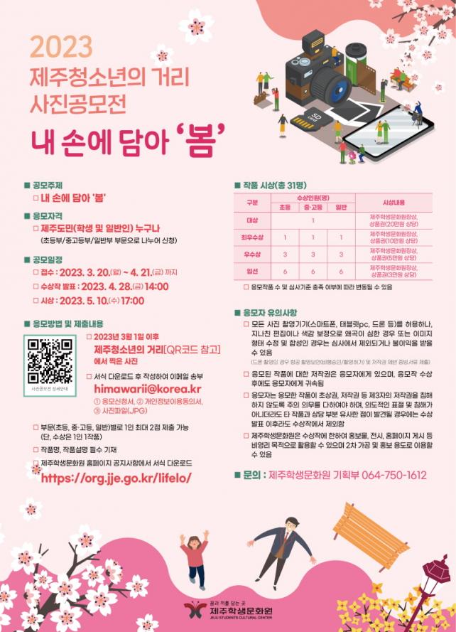 °ø¸ð±â°£Àº 2023³â 3¿ù 20ÀÏ(¿ù)ºÎÅÍ 4¿ù 21ÀÏ(±Ý)±îÁöÀ̸ç, Á¦ÁÖÇлý¹®È¿ø°ú ¼ö¿î±Ù¸°°ø¿øÀ» ¾Æ¿ì¸£´Â Á¦ÁÖû¼Ò³âÀÇ °Å¸® ÀÏ´ë¿¡¼ Á÷Á¢ ÃÔ¿µÇÑ »çÁøÀ» 1ÀÎ 2ÀÛǰ À̳»·Î ÀÀ¸ðÇÒ ¼ö ÀÖ´Ù. ÃʵîºÎ, Áß‧°íµîºÎ, ÀϹݺηΠ³ª´©¾î Á¢¼ö ¹× ½É»ç°¡ ÀÌ·ç¾îÁö°í ¼ö»óÀÛÀº 4¿ù 28ÀÏ(±Ý) Á¦ÁÖÇлý¹®È¿ø ȨÆäÀÌÁö¸¦ ÅëÇØ ¾È³»µÇ¸ç, ´ë»ó 1¸íÀ» Æ÷ÇÔ ÃÑ 31¸í¿¡°Ô »óÀå°ú »óǰÀÌ ¼ö¿©µÉ ¿¹Á¤ÀÌ´Ù.