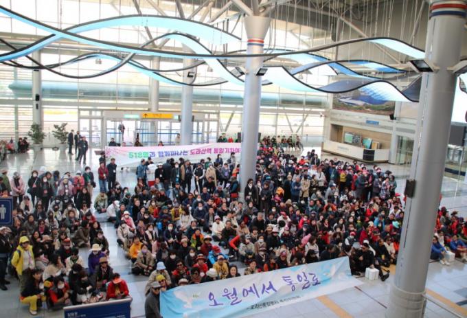 ¡®¿À¿ù¿¡¼ ÅëÀϷΡ¯¶ó´Â ÁÖÁ¦ ¾Æ·¡ 5¡¤18¹ÎÁÖȿ »çÀûÁö°¡ ÀÖ´Â ±¤ÁÖ¿ª¿¡¼ µµ¶ó»ê¿ª°ú µµ¶ó»ê ÆòȰø¿ø±îÁö À̸£´Â ÄÚ½º°¡ ´«±æÀ» ²ø¾ú´Ù.