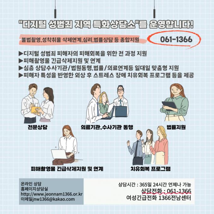 ¡®µðÁöÅÐ ¼º¹üÁË Áö¿ª ƯȻó´ã¼Ò¡¯´Â »ó´ãÀüÈ(061-1366)¸¦ ÅëÇØ 365ÀÏ 24½Ã°£ ¾ðÁ¦³ª Àü¹® »ó´ã»ç¿Í »ó´ãÇÒ ¼ö ÀÖ´Ù. 2021³âºÎÅÍ ¿©¼º°¡Á·ºÎ¿¡¼ ¸Å³â °ø¸ð¸¦ ÅëÇØ Áö¿øÇÏ´Â »ç¾÷À¸·Î Áö³ÇØ ¿©¼º°¡Á·ºÎ ÁÖ°ü ¡®2023³â µðÁöÅÐ ¼º¹üÁË Æ¯ÈÇÁ·Î±×·¥ Áö¿ø °ø¸ð»ç¾÷¡¯¿¡ ¼±Á¤µÅ ¡®¿©¼º±ä±ÞÀüÈ 1366Àü³²¼¾ÅÍ¡¯¿¡¼ ¿î¿µÇÑ´Ù.