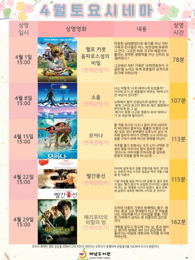 ¼±Á¤µÈ ¿µÈ´Â ¸ÅÁÖ Åä¿äÀÏ ¿ÀÈÄ 3½Ã µµ¼°ü °´ç¿¡¼ ¹«·á »ó¿µµÇ¸ç, ÀÚ¼¼ÇÑ ÀÏÁ¤Àº ºÙÀÓÀÚ·á ¹× È¨ÆäÀÌÁö(https://org.jje.go.kr/lib/index.jje)¸¦ Âü°íÇϰųª ÀüÈ(T.766-4600)·Î ¹®ÀÇÇÏ¸é µÈ´Ù.