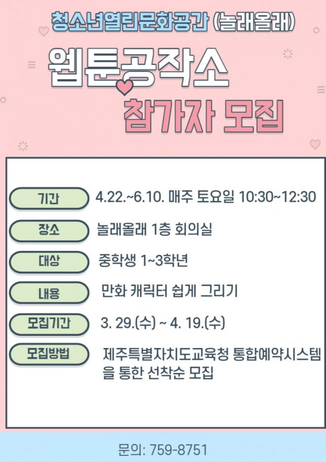À̹ø ÇÁ·Î±×·¥Àº ¸¸È ij¸¯ÅÍ ½±°Ô ±×¸®±â¸¦ ¹ÙÅÁÀ¸·Î ij¸¯ÅÍÀÇ ¾ó±¼, ¼Õ, ¹ß, ¸ö ±¸Á¶ µîÀ» Ç¥ÇöÇØ º¸´Â ¹æ¹ýÀ» ¹è¿öº»´Ù. ¸ðÁý´ë»óÀº ÁßÇлý 1~3Çгâ 10¸íÀ¸·Î 4¿ù 22ÀÏ(Åä)ºÎÅÍ 6¿ù 10ÀÏ(Åä)±îÁö(8ȸ) ¸ÅÁÖ Åä¿äÀÏ ¿ÀÀü 10½Ã 30ºÐºÎÅÍ 12½Ã 30ºÐ±îÁö û¼Ò³â ¿¸°¹®È°ø°£(³î·¡¿Ã·¡) 1Ãþ »ó´ã½Ç¿¡¼ ¿î¿µÇϸç, ¸ðÁýÀº ¿À´Â 3¿ù 29ÀÏ(¼ö) 10½ÃºÎÅÍ Á¦ÁÖÆ¯º°ÀÚÄ¡µµ±³À°Ã» °ø°øµµ¼°ü ȨÆäÀÌÁö¿¡¼ ½ÅûÇÒ ¼ö ÀÖ´Ù. ±âŸ ÀÚ¼¼ÇÑ »çÇ×Àº û¼Ò³â ¿¸°¹®È°ø°£[³î·¡¿Ã·¡](¢Ï759-8751)À¸·Î ÀüÈ ¹®ÀÇ ¶Ç´Â µµ¼°ü ȨÆäÀÌÁö °øÁö»çÇ×À» ÂüÁ¶ÇÏ¸é µÈ´Ù.