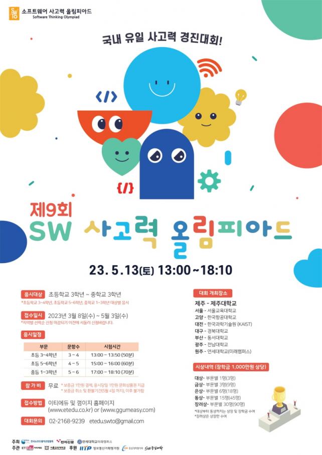 Á¦ÁÖ´ë SWÀ¶ÇÕ±³À°¿ø(¿øÀå ¼Û¿Õö) ÁÖ°üÀ¸·Î °³ÃֵǴ À̹ø ´ëȸ´Â ¼ÒÇÁÆ®¿þ¾î ÀÎÀç ¾ç¼ºÀ» À§ÇÑ ±¹³» À¯ÀÏÀÇ »ç°í·Â °æÁø´ëȸ·Î, Á¦ÁÖ, ¼¿ï, °í¾ç, ´ëÀü, ´ë±¸, ºÎ»ê, ±¤ÁÖ, ¿øÁÖ µî Àü±¹ÀÇ ´ëÇб³¿¡¼ ÁøÇàµÈ´Ù.