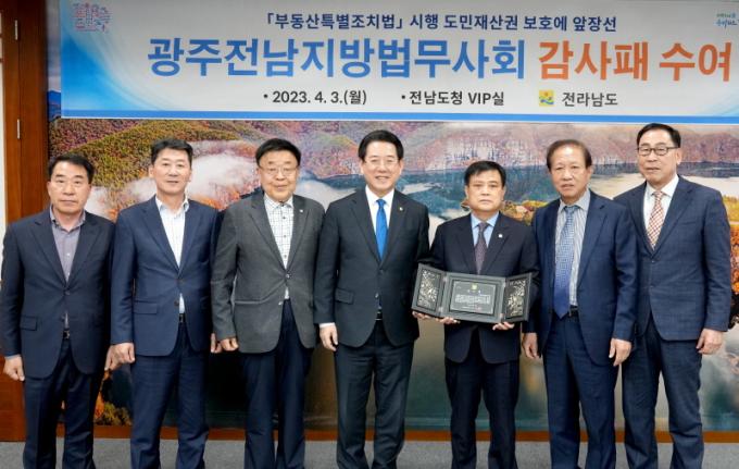 °¨»çÆÐ Àü´Þ½Ä¿¡´Â ±è¿µ·Ï Àü³²µµÁö»ç¿Í Á¤´ö¾È ±¤ÁÖÀü³²Áö¹æ¹ý¹«»çȸÀå, ±èÈ«¹è¡¤ÀÓä¿ ºÎȸÀå, ±è¿µÃá »ç¹«±¹Àå µî °ü°èÀÚ°¡ Âü¼®Çß´Ù.