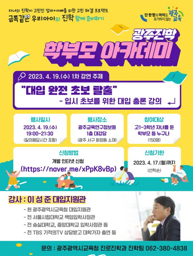 ù °ÀÇ´Â ¡®´ëÀÔ ¿ÏÀü Ãʺ¸ Å»Ã⡯À̶ó´Â ÁÖÁ¦·Î, ¿À´Â 19ÀÏ 19~21½Ã ±¤ÁÖ±³À°¿¬±¸Á¤º¸¿ø 1Ãþ ´ë°´ç¿¡¼ ÁøÇàµÈ´Ù. ¼þ½Ç´ë¡¤Áß¾Ó´ë ÀÔÇлçÁ¤°ü, ¼¿ï½Ã¸³´ë Ã¥ÀÓÀÔÇлçÁ¤°üÀ» ¿ªÀÓÇÑ ´ëÇÐ ÀԽà Àü¹®°¡ÀÎ Çö ½Ã±³À°Ã» À̼ºÁØ ´ëÀÔÁö¿ø°üÀÌ °»ç·Î ³ª¼±´Ù.