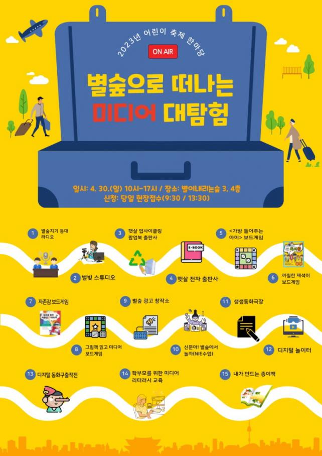 4¿ù 30ÀÏ(ÀÏ) 10½ÃºÎÅÍ º°ÀÌ ³»¸®´Â ½£ 3Ãþ, 4Ãþ ÀÏ¿ø¿¡¼ ¹Ìµð¾î±³À°¿¬±¸È¸¡®ON¡¯(±¸, Á¦ÁÖ NIEÇÐȸ)°ú Çù¾÷ÇÏ¿© 15°³ÀÇ ÇÁ·Î±×·¥À» ¿î¿µÇÑ´Ù. ¢º µµ¼°ü¿¡¼ üÇèÇÏ´Â ÀüÆÄ ¹Ìµð¾î¡®º°ºûÁö±â µî´ë ¶óµð¿À¡¯ ¢º µµ¼°ü¿¡¼ üÇèÇÏ´Â ¹æ¼Û ¹Ìµð¾î¡®º°ºû ½ºÆ©µð¿À¡¯ ¢º ÀçȰ¿ëÀÌ Èûµç ±×¸²Ã¥À» ÀÌ¿ëÇÑ ¡®ÇÞ»ì ¾÷»çÀÌŬ¸µ ÆË¾÷ºÏ ÃâÆÇ»ç¡¯ ¢º µ¿ÈÃ¥°ú ±×¸²Ã¥À» ÀÌ¿ëÇÑ º¸µå°ÔÀÓ ¢º º°ÀÌ ³»¸®´Â ½£ È«º¸¿µ»óÀ» Á¦ÀÛÇϴ¡®±¤°í âÀÛ¼Ò¡¯ ¢º »ý°¢ÀÇ °æ°è¸¦ Ç㹫´Â NIE(½Å¹®È°¿ë¼ö¾÷)¡®½Å¹®¾Æ, º°½£¿¡¼ ³îÀÚ! ¢º ±¸±Û¾ÛÀ» ÀÌ¿ëÇÑ 3D ¿µ»ó ÃÔ¿µ¡®µðÁöÅÐ ³îÀÌÅÍ¡¯ ¢º Çкθ𸦠À§ÇÑ µðÁöÅÐ ¹Ìµð¾î ¸®ÅÍ·¯½Ã ±³À° üÇè µî À¯¾ÆºÎÅÍ ¼ºÀαîÁö ¹Ìµð¾î·Î Áñ±æ ¼ö ÀÖ´Â ´Ù¾çÇÑ ÇÁ·Î±×·¥ÀÌ ÁøÇàµÉ ¿¹Á¤ÀÌ´Ù.