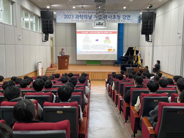 [È£³²µµ¹Î½Å¹® = ÀÓÀ±Áø ±âÀÚ] Á¦ÁÖ°úÇаíµîÇб³(±³Àå ÀÌÃ¢ÈÆ)´Â 4¿ù 21ÀÏ(±Ý) 6~7±³½Ã¿¡ Çб³ °´ç¿¡¼ Àü±³»ýÀ» ´ë»óÀ¸·Î¡®°úÇÐÀÇ ³¯ ±â³ä ¸í»ç ÃÊû °¿¬¡¯À» ½Ç½ÃÇß´Ù.