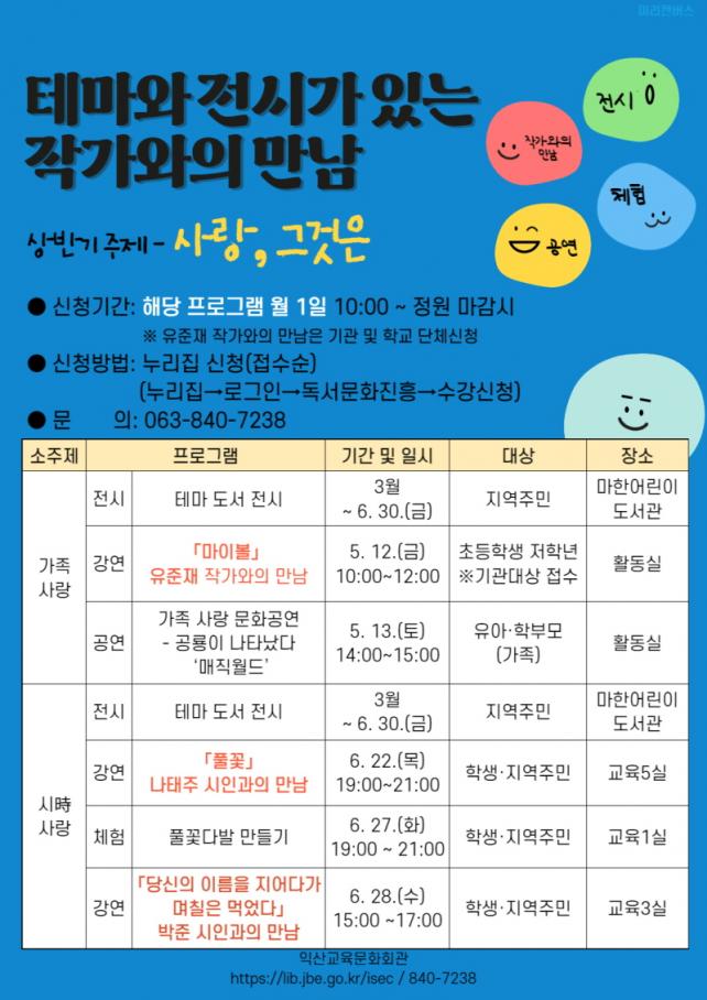 »ó¹Ý±â Å׸¶´Â ¡®°¡Á· »ç¶û¡¯°ú ¡®½Ã »ç¶û¡¯À̶ó´Â µÎ °¡Áö ¼ÒÁÖÁ¦·Î ¼¼ºÎ ¿î¿µµÇ¸ç, Àͻ걳À°¹®Èȸ°ü 1Ãþ ¸¶ÇѾÀ̵µ¼°ü¿¡¼ Å׸¶ µµ¼ Àü½Ã¸¦ ¸¸³ªº¼ ¼ö ÀÖ´Ù. °¡Á· »ç¶û¡¯À̶ó´Â ¼ÒÁÖÁ¦´Â ´Ù°¡¿À´Â 5¿ù 12ÀÏ ±Ý¿äÀÏ ±×¸²Ã¥¡¸¸¶À̺¼¡¹ÀÇ ÀúÀÚÀÎ À¯ÁØÀç ÀÛ°¡¿ÍÀÇ ¸¸³²°ú °¡Á·ÀÌ ÇÔ²²ÇÏ´Â ½Ã°£À» º¸³¾ ¼ö ÀÖ´Â °¡Á· »ç¶û ¹®È°ø¿¬À¸·Î ¡®°ø·æÀÌ ³ªÅ¸³µ´Ù – ¸ÅÁ÷¿ùµå¡¯°¡ 5¿ù 13ÀÏ Åä¿äÀÏ¿¡ ¿î¿µµÈ´Ù.