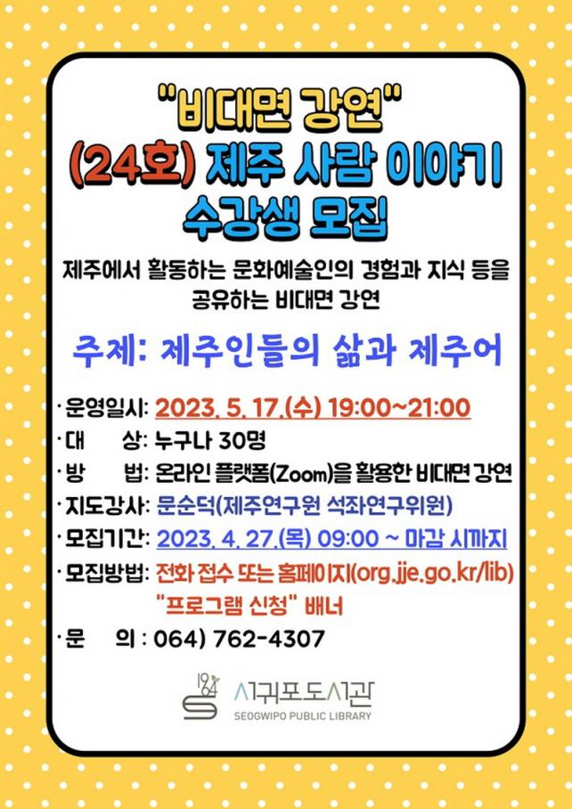 ºñ´ë¸é ¿Â¶óÀÎ(Zoom) ¹æ½ÄÀ¸·Î ÁøÇàµÇ´Â À̹ø °¿¬Àº ¹®¼ø´ö(Á¦ÁÖ¿¬±¸¿ø ¼®Á¿¬±¸À§¿ø) °»ç¸¦ ¸ð½Ã°í¡®Á¦ÁÖÀεéÀÇ »î°ú Á¦Á־¶ó´Â ÁÖÁ¦·Î ¿À´Â 5¿ù 17ÀÏ(¼ö) ¿ÀÈÄ 7~9½Ã¿¡ ¿î¿µµÈ´Ù.
