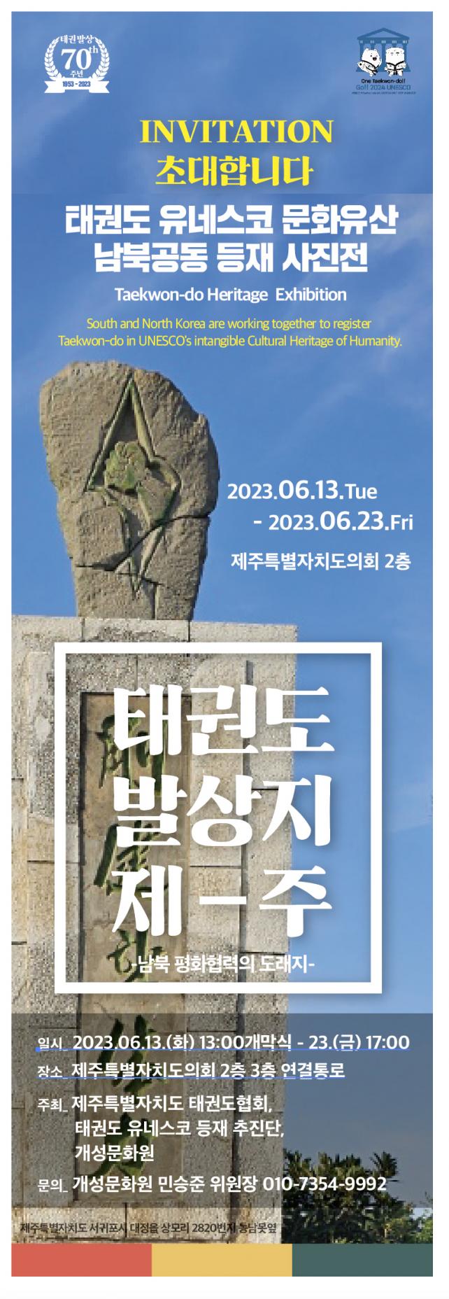 Á¦ÁÖÆ¯º°ÀÚÄ¡µµ űǵµÇùȸ(ȸÀå ±èÁ¾¹Î), ±¹±â¿ø űǵµ À¯³×½ºÄÚ µîÀçÃßÁø´Ü(´ÜÀå ÃÖÀçÃá), °³¼º¹®È¿ø(¿øÀå ¹ÎÁöÇý)ÀÌ °øµ¿À¸·Î ÁÖÃÖÇÏ´Â À̹ø »çÁøÀüÀº 1953³â Á¦ÁÖ¿¡¼ ½ÃÀÛµÈ Å±ǵµ ¹®È¿Í ¿ª»ç »çÁø 30¿© Á¡ÀÌ Á¦ÁÖµµÀÇȸ ÀÇ»ç´ç 2~3Ãþ ¿¬°áÅë·Î¿¡ Àü½ÃµÅ 23ÀÏ(±Ý)±îÁö 2ÁÖ°£ µµ¹Îµé°ú ¸¸³´Ù. ƯÈ÷, 1Ãþ ·Îºñ¿¡¼´Â űǵµ À¯³×½ºÄÚ ³²ºÏ°øµ¿ µîÀç ÃßÁø´Ü È«º¸´ë»êÀÎ ¡®Çѹݵµ ÆòȰø°¨ ij¸¯ÅÍ Ç³ÀÌ ÁøÀÌ¡¯¿Í ÇÔ²²ÇÏ´Â ¡®Å±ǵµ À¯³×½ºÄÚ µîÀç 縰Áö¡¯ Ä·ÆäÀεµ ÇÔ²² ÁøÇàµÈ´Ù.