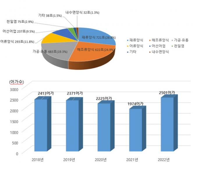 ¾÷Á¾º°·Î´Â Àüº¹, ±¼, ²¿¸· µî ÆÐ·ù ¾ç½ÄÀÌ 721¾î°¡(28.8%)·Î °¡Àå ¸¹¾Ò°í ±è¡¤¹Ì¿ª µî ÇØÁ¶·ù ¾ç½Ä 622¾î°¡(24.9%), ±¼ºñ µî °¡°ø¡¤À¯Åë 483¾î°¡(19.3%), ³ÒÄ¡¡¤¿ì·° µî ¾î·ù¾ç½Ä 293¾î°¡(11.8%), ¾î¼±¾î¾÷ 237¾î°¡(9.5%) ¼øÀ̾ú´Ù.